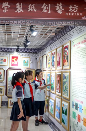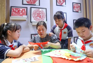 2023年7月18日,四川省华蓥市的老师在文创坊为暑假中的小朋友义务辅导剪纸艺术。