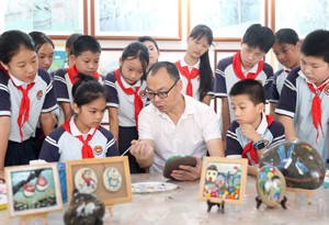 2023年7月18日,四川省华蓥市暑假中的小朋友在文创坊学习石画艺术。