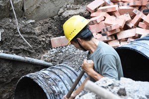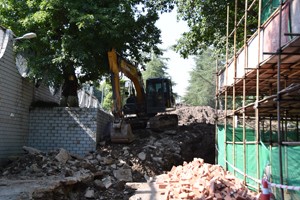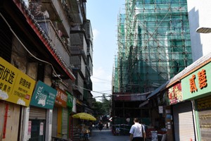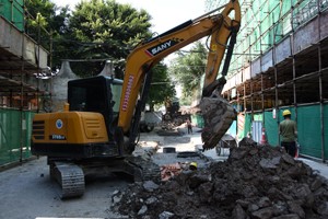打了施工安全围栏的文庙巷,就是荣县人习惯称呼的“荣中巷”,记者走进施工现场看到,荣县中学校门口左右两旁房子,全部搭设了施工外架和安全防护网,外架内有工人像“蜘蛛人”一样“悬”在高高的外墙上进行装饰作业;往日的荣县中学校门已经被拆除,一台挖机正在校门口作业;巷子内的地面下,一根直径800毫米的雨水管和一根600毫米的污水管已经被埋下,正在向外延伸……