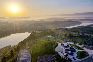 图为2023年7月23日,晨曦和薄雾把四川省广安市渠江红滩音乐公园映衬得格外美丽祥和。 (邱海鹰)