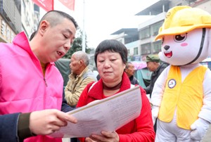 2023年11月24日,四川省广安市社会保险局组织的志愿服务小分队,带着“安宝”在华蓥市高兴镇向赶场的群众讲解利用移动网络查询参保情况的方法。(邱海鹰)