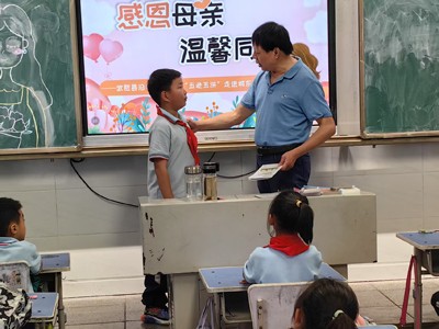 在活动中,还有一特殊的孩子引起了大家的关注。由于特殊原因,他们的母亲无法陪伴在身边。迎宾社区“关爱之家”的“张妈妈”一直心系着这位孩子,此次她带着精心准备的礼物来到教室,将一个个崭新的水杯、一盒盒色彩斑斓的彩笔以及一套套实用的文具送到孩子手中。这份礼物都承载着“张妈妈”对孩子满满的爱与关怀,她鼓励孩子要勇敢坚强,努力学习,用知识改变命运。孩子接过礼物,脸上洋溢着幸福的笑容,用稚嫩的声音向“张妈妈”表达感谢。