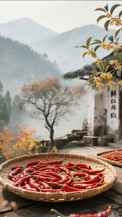 远山的剪影斜斜地倚在天际,如同水墨画中未干的墨痕,浓淡相宜,意境悠远,仿佛时间在此刻也学会了留白。嘉陵江的支流在不远处蜿蜒流淌,水声轻缓如吟,像极了祖母在夏夜摇着蒲扇时哼唱的那首古老歌谣,低回婉转,沁入心脾,唤醒了记忆深处最柔软的角落。院角那几株桂树,悄然吐露着细碎而清冽的芬芳,不张扬,却足以让整个小院都浸染上秋日特有的气息。风儿轻轻一拂,香气便调皮地跃入竹匾,与那一堆堆晾晒的红辣椒撞了个满怀——红的热烈奔放,香的清幽内敛,恰似川中女子外刚内柔、刚柔并济的性情,热烈中藏着温婉,烟火里透着诗意。