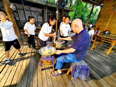 在川西林盘院子里的石磨旁,他示范研磨的“稳与匀”,指导同学们将自己亲自采摘的玉米,掰碎洗净磨浆制作玉米馍,将磨浆过程比作学习解题,强调“慢工出细活”。