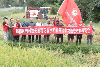 金秋时节,艳阳高照。郫都区安德街道安龙村的稻田里,稻浪翻滚、金穗飘香,一派丰收景象尽呈眼底。9月12日下午,郫都区老科协在此举行“天府稻花香”水稻新品种试验示范种植收割现场会。成都市老科协服务三农工委主任余建明率队赴此,与郫都区老科协会会长彭富全、副会长兼秘书长马洪春,三农工委主任余春林以及老科协银龄行动志愿服务队队员,共同参加水稻新品种收割现场会暨示范推广座谈交流活动。市、区老科协联手支农助农,以科技为笔,绘就乡村振兴丰收图景。