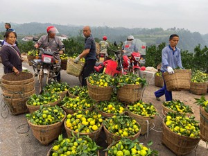 在该村2组收购点,一辆9米长的辽宁省车牌大货车占据了整条村路,沿着田间小路望去,种植大户吴明国抓住新津蜜橘盛产期尾声,聘请若干名村民正在他的30余亩柑橘地里采摘,有的村民在树上剪果子,有的将大家采摘的果子统一装起来,有的用扁担挑着两大箩筐往收购点走来。