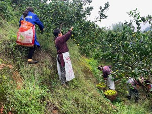 一辆辆摩托从对面山上载运着果子来到集中收购点,它们一路高歌“唱”出“欢快”的轰鸣声,在树上用剪刀收获着蜜橘的果农们聊着家常,时而发出一阵欢声笑语,现场热闹的蜜橘丰收景象映入眼帘。