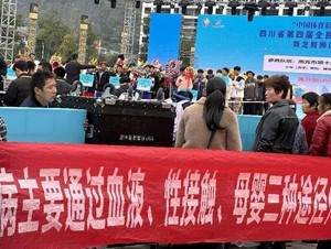 为提高广大参赛运动员和市民群众预防和控制艾滋病的意识和能力,11月18日,兴文县老科协乘"四川省体育局、四川省民族宗教事务委员会、四川省残疾人联合会、四川省体育总会"举办,"四川省龙狮运动协会、中共兴文县委、兴文县政府"承办的"中国体育彩票杯 四川省第四届全民健身运动会舞龙舞狮比赛”活动在兴文举办之机广泛开展艾滋病预防和控制宣传活动。