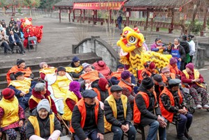 2023年12月20日,四川省华蓥市禄市镇凉水井村幸福院的老人在欣赏民间艺人表演舞狮。