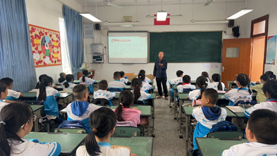 老科协会长卫志中老师则以《了解郫都历史,坚定文化自信》为主题,讲述郫都以及学校所在地友爱镇的悠久历史和灿烂文化,让孩子们在轻松愉快的氛围中感受到了中华文化的博大精深,卫老师从友爱镇、子云学校的得名讲起,再讲区名,从“郫”“都”两个字的偏旁入手,探寻字源,让学生领略到了“郫都”字的深厚底蕴。