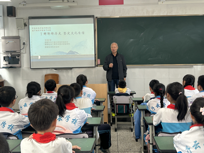 老科协教科工委主任徐常云为同学们宣讲了郫都区抗日民族英雄解固基的英雄事迹,徐爷爷鼓励子云学校学生要珍惜时光、勤奋学习,努力成为德智体美劳全面发展的社会主义建设者和接班人,同学聚精会神聆听,不时热烈鼓掌。