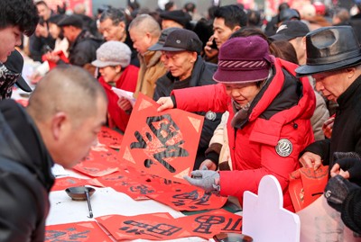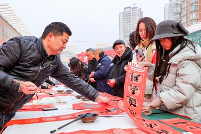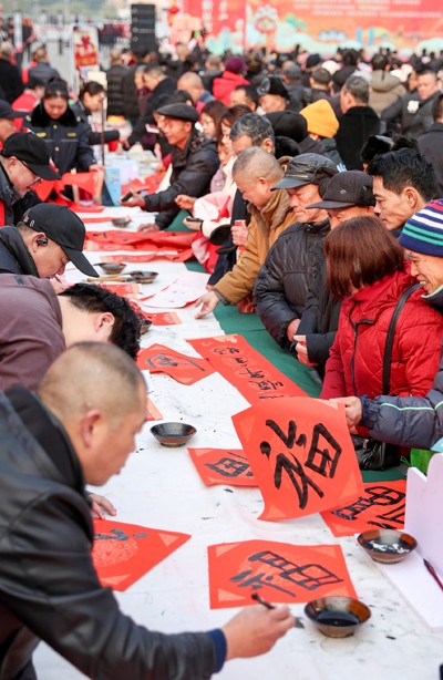 2025年1月20日,四川省华蓥市书法家协会的志愿者来到人流量较大的华蓥山广场,为市民义务书写春联和“福”字等门贴,祝福市民过上一个快乐祥和的新春佳节。