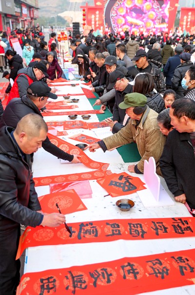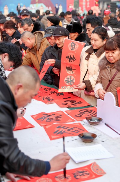 2025年1月20日,四川省华蓥市的书法志愿者在华蓥山广场义务为市民书写春联和“福”字门贴。(邱海鹰)