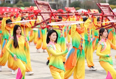 2025年1月26日,四川省华蓥市的市民汇聚在工人文化宫广场,展演云童舞、滑竿抬幺妹、彩蚌壳、打连厢等颇具地方特色的民俗文化,在欢天喜地中迎接新春佳节来临。
