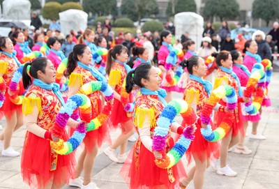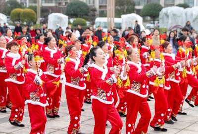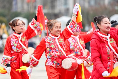 2025年1月26日,四川省华蓥市市民在工人文化宫广场展演民俗文化节目腰鼓舞,迎接新春佳节来临。