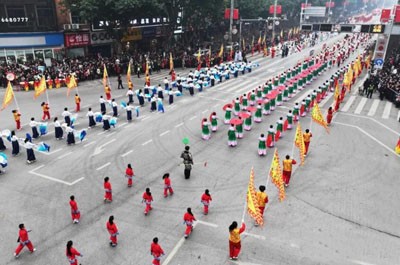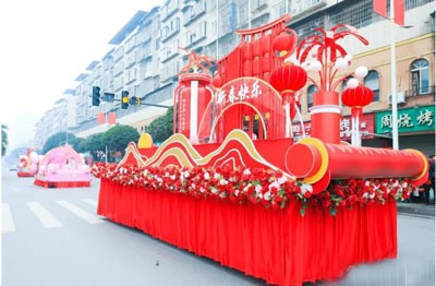 上午9时许,武胜县城地标建筑牌坊处十字路口锣鼓喧天,彩旗招展。由6台彩车领头的巡游队伍精神抖擞,整装待发,紧随其后的是彩龙、彩狮和高跷队。包含腰鼓、长扇、国潮、花灯等8个具有地方特色的方阵连绵排列,沿县城主要街道向人民广场进行巡游展演。