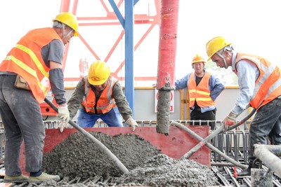 西渝高铁康渝段站前11标的中铁十局的建设者在广安东站四线中桥冒着酷热紧张施工。(邱海鹰 柏见真/文图)