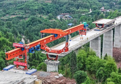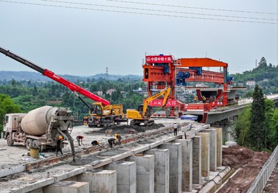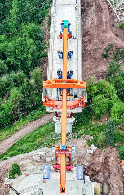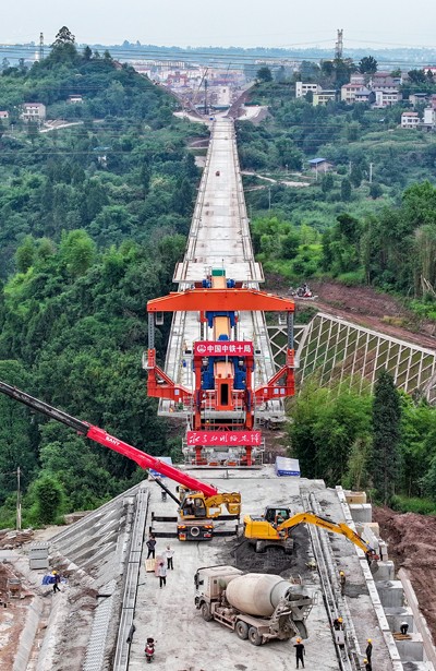 2025年6月5日,在四川省广安华蓥市明月镇拍摄的由中铁十局承建的西渝高铁何家湾特大桥梁架设施工现场。(邱海鹰 刘 忠/文图)