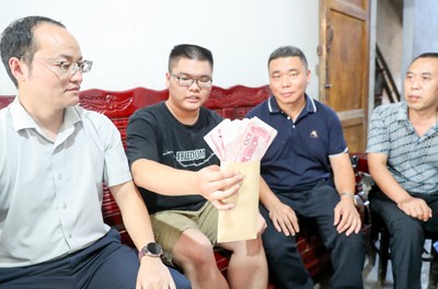 2025年9月4日,四川润祥人力资源管理有限公司董事长、华蓥市政协委员程家亮,专程把1万元助学金送到刘渝鑫手中。(邱海鹰/摄影报道)
