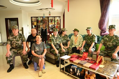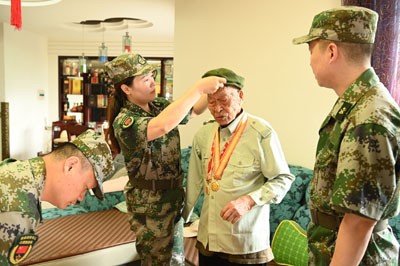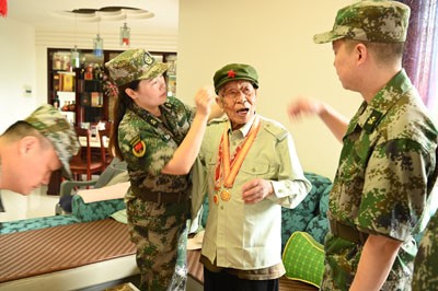 “老人家,您坐下,我们帮您佩戴抗日纪念章!”9月3日,荣县退役军人志愿服务队队员们8点30分就来到荣县新城区抗战老兵梁定江家,为老人佩戴好抗战胜利80周年纪念章并戴好军帽,坐在客厅等待阅兵式正式开幕!