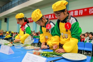 2023年11月2日,在四川省华蓥市双河小学举办的“我是小能人,自理能力我最行”为主题的校园劳动节学生秀厨艺活动上,参加选手在制做凉菜。