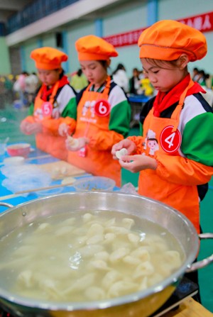 2023年11月2日,在四川省华蓥市双河小学举办的“我是小能人,自理能力我最行”为主题的校园劳动节学生秀厨艺活动上,参加选手在包煮饺子。