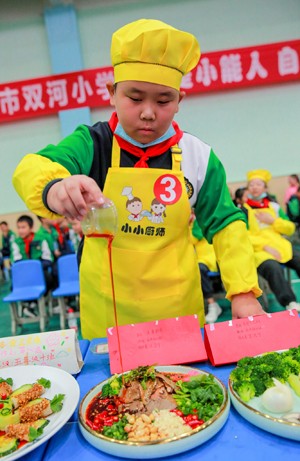 2023年11月2日,在四川省华蓥市双河小学举办的“我是小能人,自理能力我最行”为主题的校园劳动节学生秀厨艺活动上,参加选手在放兑调料。