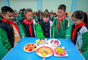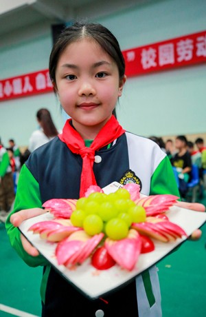 2023年11月2日,在四川省华蓥市双河小学举办的“我是小能人,自理能力我最行”为主题的校园劳动节学生秀厨艺活动上,参加选手在展示自己制做的水果拼盘。