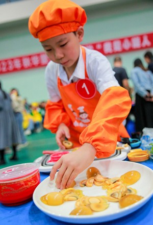 2023年11月2日,在四川省华蓥市双河小学举办的“我是小能人,自理能力我最行”为主题的校园劳动节学生秀厨艺活动上,参加选手在制做拼盘。