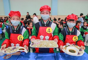 2023年11月2日,在四川省华蓥市双河小学举办的“我是小能人,自理能力我最行”为主题的校园劳动节学生秀厨艺活动上,参加选手在展示自己制做的水饺。