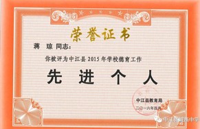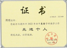 蒋琼,高级教师,从事初中英语教学兼班主任工作。曾被评为“德阳市优秀班主任”、“德阳市教学先进个人”、“德阳市教坛新秀”和县级“优秀教师”、“师德标兵”、“学科带头人”、“德育工作先进个人”、“优秀班主任”等。