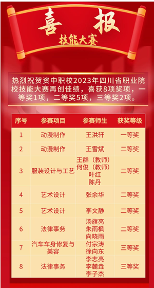春华秋实,辛勤的耕耘总会迎来收获的喜悦。2023年11月,资中职校参加四川省职业院校“中银杯”技能大赛再获佳绩,师生共获奖项8项,其中获一等奖1项,二等奖5项,三等奖2项。
