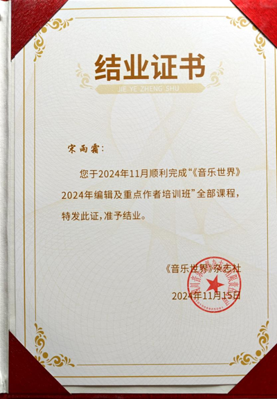 2024年11月13日至15日,《音乐世界》2024年编辑及重点作者培训班在成都举行。成都文理学院文法学院写作课程负责人宋雨霜老师作为重点作者受邀参加培训活动,并获得结业证书。