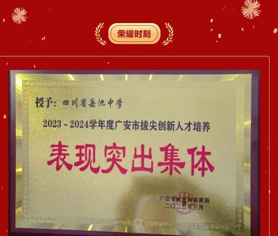 2025年3月7日,在广安市2024年高考总结会暨2025年高考冲刺动员会上,岳池中学校荣获“2023-2024学年度广安市普通高中高质量发展表现突出集体”和“2023-2024学年度广安市拔尖创新人才培养表现突出集体”2项荣誉称号!