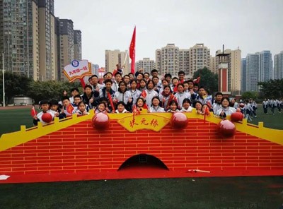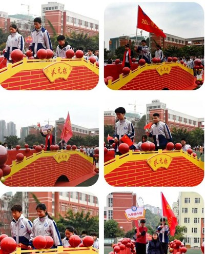 晨光初绽,初三师生踏着激昂的鼓点,从“奋斗门”出发,踏过象征智慧积淀的“状元桥”,迈向满载期许的“成功台”。