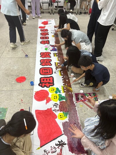 而最具视觉冲击力的当属“画笔礼赞祖国”环节。同学们铺开5米长的绘画长卷,学生们分工协作,用画笔勾勒天安门、长城、国旗等元素,以绚丽色彩诉说对祖国的热爱;还有班级为每位同学准备空白扇子,大家或绘五星、或题“我爱中国”,一把把独具特色的扇子,成为承载爱国情感的“移动画卷”。