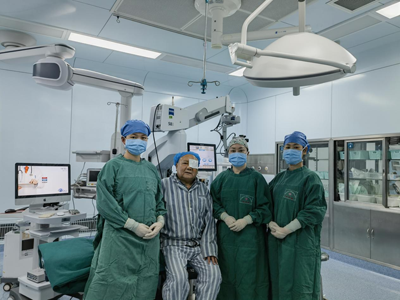 图为:眼科主任牟琳教授亲自带领医护团队成功为72岁患者李立权实施白内障手术