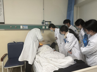 图为:眼科张可杰教授精心指导医护人员为患者李立权术后白内障科学治疗护理工作