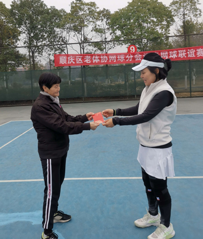 2025年1月 22 日,南充市顺庆区老体协网球分会主席胡兰前往该市体育公园网球场,代表分会全体会员,向正在打扫球场卫生的谢淑蓉送上 1000 元慰问金,表达对她一年辛勤付出的感激,同时祝福谢淑蓉及其家人新春安康幸福。