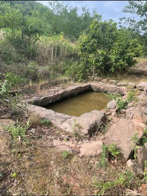 在七星村村干部周建平的带领下,我们一行前往连二寨所在的周家湾,首先查看了被称为前寨的王家寨,山顶有一名为蓬溪县黎稳当的家庭农场,养殖着数头鸵鸟和几十只旱养大鹅,种植了几十亩中药材。有一约6平方米左右的蓄水池,甚为古朴。