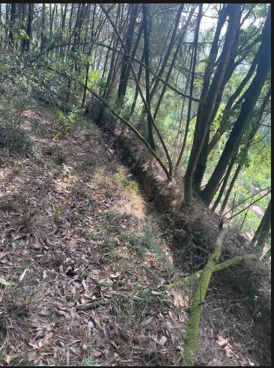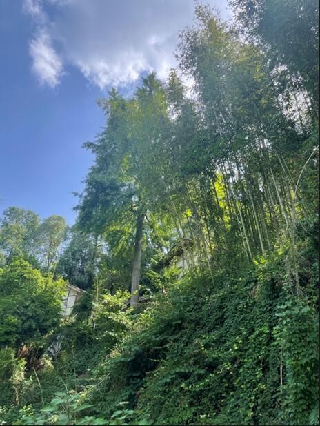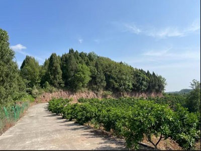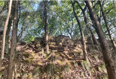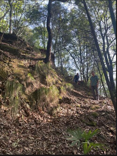 从王家寨出来,沿另一入山口蓬溪县照峰农业创新创业孵化园开车上山,约一公里,在被称为下寨的永乐寨寨坡下面停车。然后沿着一条垂高约20米、长500米左右的蜿蜒崎岖山路步行而上,来到一块林木葱郁的平整山顶,即为永乐古寨。