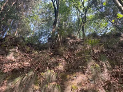 ▲从第二层坡地向上望,可见寨顶多处石墙堡垒。