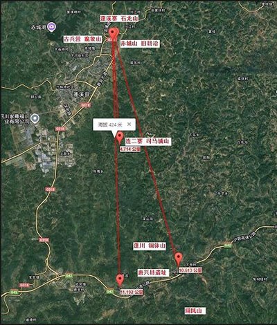▲卫星地图显示唐兴县遗址和司马城山位置与旧史记载吻合