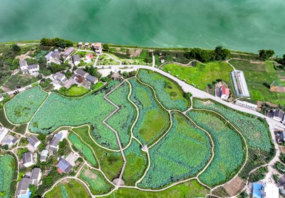 图为2025年6月24日,鸟瞰四川省华蓥市利用明月镇白鹤咀村的渠江滩涂兴建的“荷月江岸”生态荷塘景点。(邱海鹰/文图)