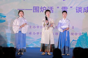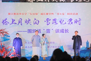 活动在悠扬的古筝中拉开帷幕。忽然,大雪纷飞,时间仿佛被拉回到了百年前周因培重建奎光塔时。在正逢大雪节气时,周因培向大家讲述了奎光塔的前世今生和重学兴文的重要性,通过后生知道了自己筹资建塔、振兴文风的成果,以及所创建的“蜚英”文舍演变为“塔子坝中学”的过程,与师生一起共睹百年后灌县学子溯古追今的一场精彩盛宴。