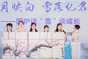 这场"盛宴"分别演绎了四个篇章。篇章一,师生们“推窗见雪,飞花净白”,走进了一场雪的记忆。从《咏雪》《踏莎行·雪似梅花》,到《梅花》《寿阳曲·江天暮雪》等,以一首首诗词,吟诵盛雪美景。后又以飞花令,对起了含“雪”字的诗句,并齐声吟诵《沁园春·雪》。