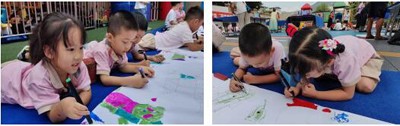 童真视野,绚丽画笔,画出独特的自己,画出童趣的真在,活动现场,天真活泼的小朋友们欢快地走上舞台,用手中的画笔和童真的语言,在两幅各二十米长的画布上描绘出了心目中的家乡都江堰,表达对天府源头秀美景色的热爱和对美好未来的向往。参加活动的书画家还有马巨良、苟绍龙、姜康明、代祥兵等老师。他们现场创作多幅书画作品,赠送宁江幼儿园,作为给孩子们的国庆礼物,希望这些作品能够在孩子们幼小的心灵播下艺术的种子,激发他们热爱祖国大好河山、学习艺术的热情。