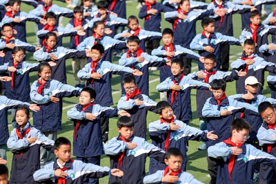 2025年3月27日,四川省华蓥市红岩小学的小交警利用大课间领学“交通手势操”,迎接第30个“全国中小学生安全教育日”。(邱海鹰 陈 敏)