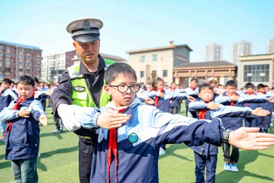 2025年3月27日,四川省华蓥市红岩小学的学生在交通警察的指导下,利用大课间练习“交通手势操”,迎接第30个“全国中小学生安全教育日”。