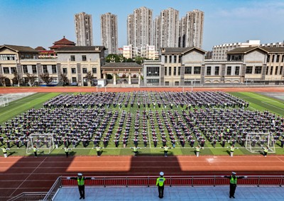 2025年3月27日,四川省华蓥市红岩小学的学生利用大课间练习交通警察手势信号广播体操(简称“交通手势操”),迎接第30个“全国中小学生安全教育日”。